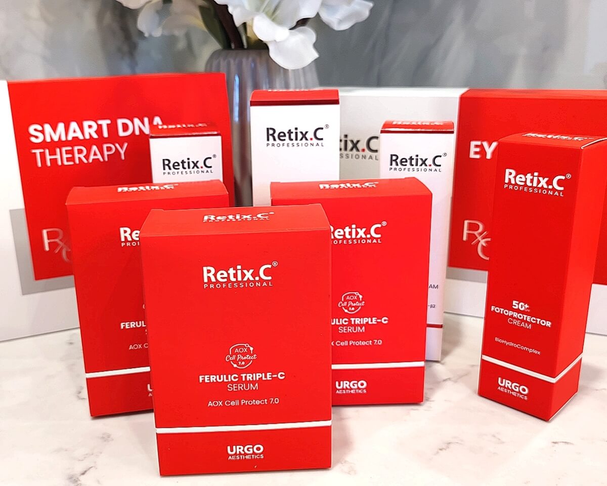 Retix C to intensywna złuszczająca kuracja odmładzająca łącząca moc dwóch składników kosmetycznych – 4% retinolu i 8% witaminy C. Dochodzi tutaj do silnego pobudzenia procesów regeneracyjnych skóry. Retinol wykazuje silne właściwości odmładzające, a witamina C działa silnie przeciwutleniająco i rozświetlająco. Liczne antyoksydanty (30%) zawarte w produktach wykorzystywanych podczas zabiegu chronią skórę przed szkodliwym działaniem wolnych rodników. Proteoglikany działają nawilżająco i łagodząco, zmniejszając ryzyko podrażnień, chronią skórę przed działaniem czynników zewnętrznych.